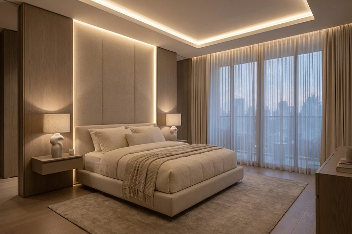 Soft ceiling and niche lighting creates a refined architectural atmosphere in the interior. Light can be directed upward or downward, providing balanced and comfortable illumination.